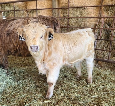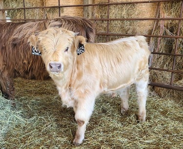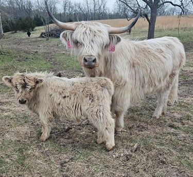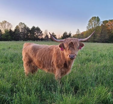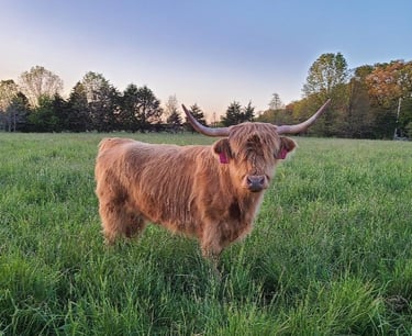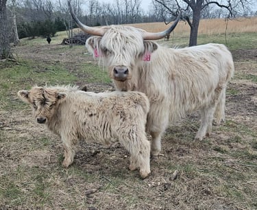 The breed is characterized by traits of hardiness, self-sufficiency, and longevity. They are excellent foragers and efficient at improving pastures and clearing woodlots. A testament of this ability was in an Oak Savanna Restoration Project in Wisconsin where the cattle and environment thrived. Their moderate frame is ideal for small and large farms alike in various climates and regions of the country. Highlands are found in all fifty states and acclimate well to the environment yet it is best to buy cattle from a climate similar to your farm. The double hair coat is a tremendous asset in adverse weather and is believed to be the reason why they have limited external fat cover. This means less to trim from carcasses and more value retained. The horns not only give them their majestic looks but are helpful with predator control. These cattle have strong maternal instincts and protect their young. In addition, Highland genetics are quite diverse from other breeds so they produce a highly productive cross.