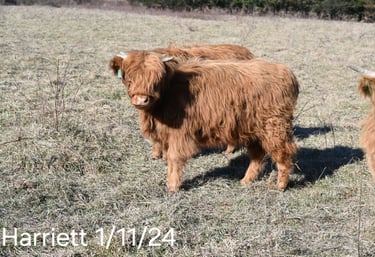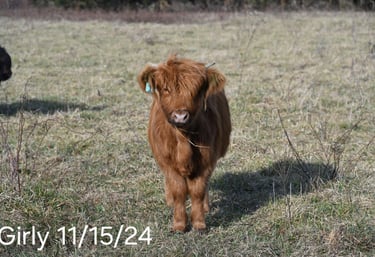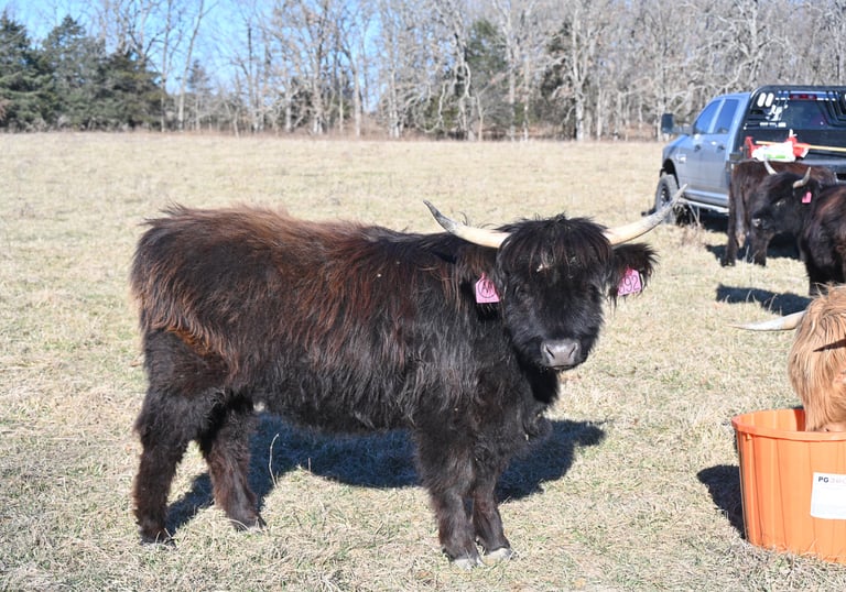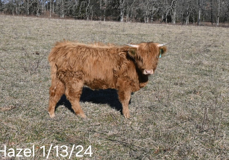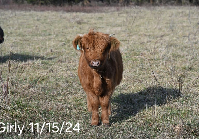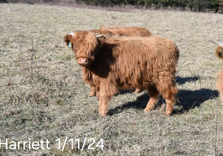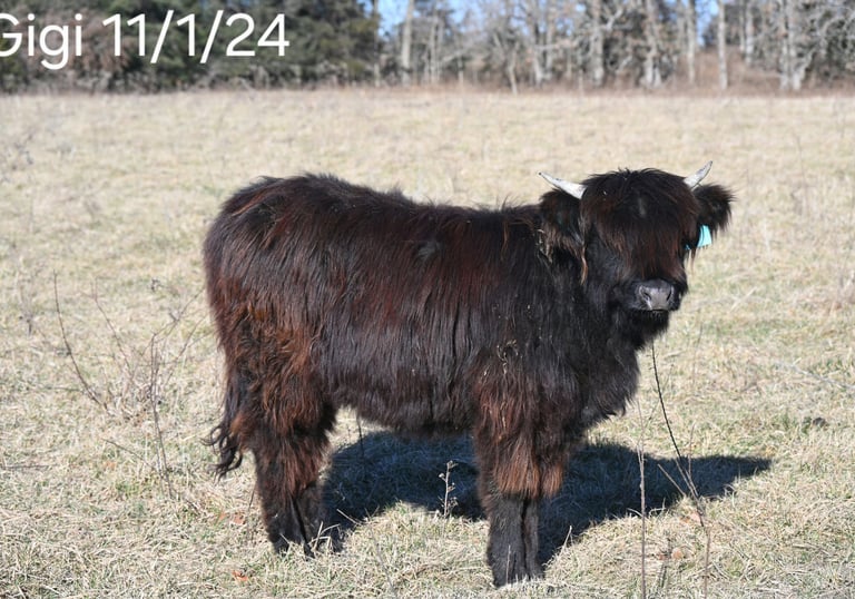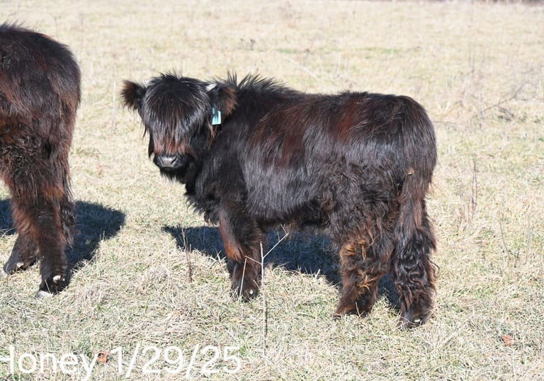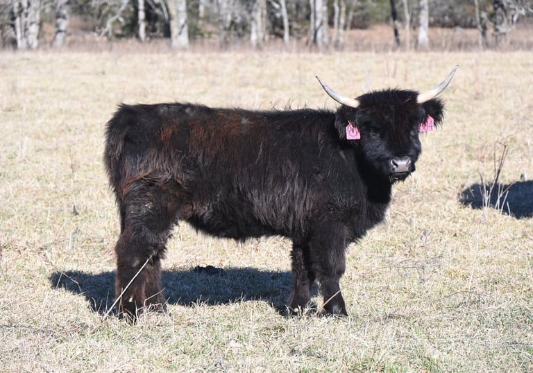 Purebred black Scottish Highland heifer born January of 2024 this is a smaller framed heifer fits in well with the herd will be ready to breed fall of 2025